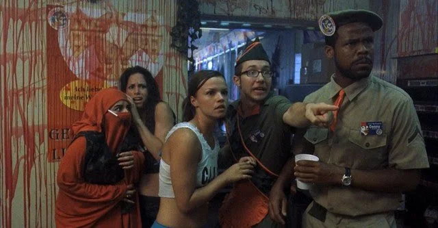 Poultrygeist follows the story of Arbie who’s ex-girlfriend Wendy comes back from college with her new girlfriend Mickie, the both of whom protesting the opening of a new American Chicken Bunker in “Tromaville” (while watching we realized that there is a widespread “Tromaverse” of interconnected movies from these guys so I can’t comment on any of this for now but maybe in the future) and Arbie being mad at his ex for being roped in with a “Femi-Nazi with no bra” as said in the movie’s first musical number (there are many and idk why but I live for it) he figures he’d get a job and “show them the beef.” As established in the opening “dry hump” sex scene, the restaurant was built on an “Indian Burial Ground” and so the spirits of the dead chickens and the Native Americans create for a sort of chicken zombie virus which gets spread on this opening ceremony. It’s really hard to say much else as much of the movie’s plot defies explanation or at least should be seen for oneself. It’s a wild and unhinged tits out, gore filled, musically excellent, romp through what I expect only the first of these “Troma” flicks I’m sure I will end up reviewing later. If you can take the movie as “seriously” as it takes itself then you’re in for a real treat.